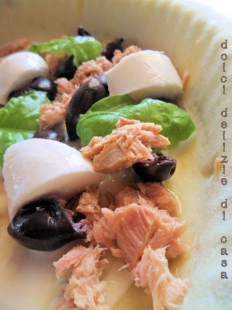 Stendere nella teglia e mettervi il tonno sgocciolato,le olive denocciolate,la mozzarella a cubetti e tanto basilico.Ricoprire con l’altra sfoglia altrettanto sottile.Spennellare d’olio e cospargere con un pò di sale(io ho usato quello grosso)Fare dei buchetti in superficie per far passare il vapore.Servire calda!
