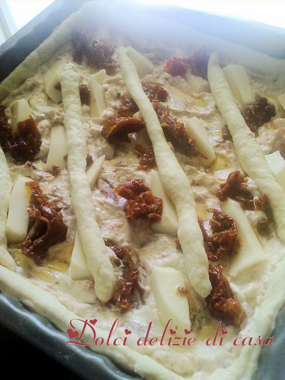 Intanto preparare il condimento.Mescolare la ricotta con la panna,il parmigiano,parte dei pomodori tritati finemente,un pò del loro olio e aggiustare di sale e pepe.Stendere parte dell’impasto in una teglia,ricoprire con la farcitura.Sopra cospargervi pezzetti di pomodori e formaggio a listarelle.Decorare a piacere con l’altro impasto.Lasciare lievitare un’altra mezz’oretta e infornare a 200° per una ventina di minuti.